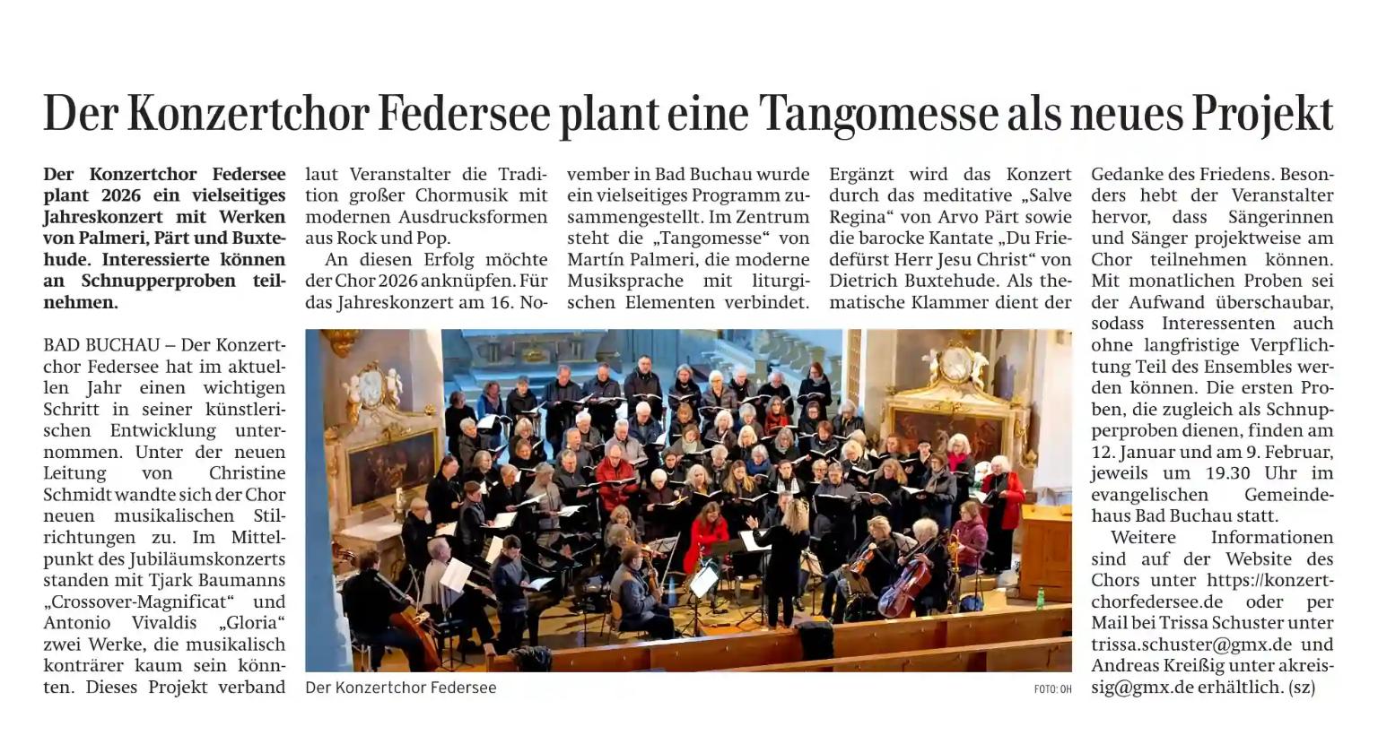Im Jahr 2025 wagte der Konzertchor Federsee einen entscheidenden Schritt in seiner künstlerischen Entwicklung. Unter der Leitung der neuen Dirigentin Christine Schmidt öffnete er sich neuen musikalischen Stilen und stellte das Crosso ver-Magnificat Tjark Baumanns neben Antonio Vivaldis Gloria in den Mittelpunkt seines Jubiläumskonzertes. Dabei ver band der Chor barocke Klangwelt mit modernen musikalischen Elementen. Dieses Projekt war nicht nur ein Experiment, sondern zugleich ein Bekenntnis zur eigenen Tradition: Vivaldi als Symbol für die große Chormusik der Vergangenheit wurde mit neuen Ausdrucksformen des Rock und Pop kombiniert, sodass ein Konzertprogramm entstand, das eine Brücke zwischen verschiedenen Epochen und Stilen schlug. An diesen Erfolg knüpft der Konzertchor im Jahr 2026 an. Für sein Jahreskonzert am 15. November 2026 stellt er ein Werk ins Zentrum, das erneut die Verbindung von Liturgie und moderner Musiksprache sucht: die Tangomesse von Martín Palmeri, die in Kombination mit dem meditativen Salve Regina Arvo Pärts und der barocken Kantate Dietrich Buxtehudes Du Friedefürst Herr Jesu Christ den Frieden thematisiert, den unsere Welt so dringend benötigt.